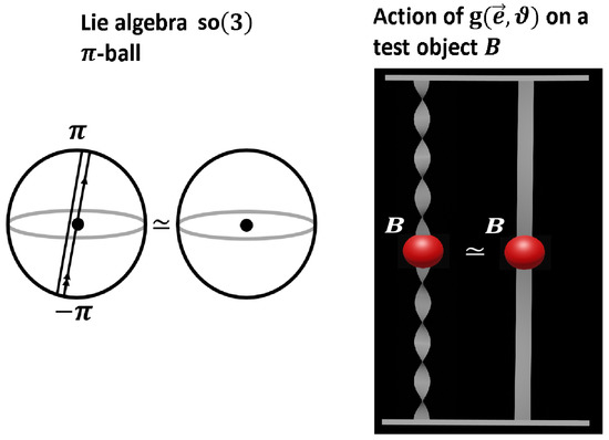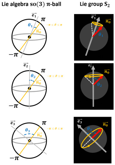Obviously, the complete group can be characterized by three parameters—the direction of the rotation axis, indicated by the unit vector with , and the rotation angle . The -ball (with radius ) defined by represents all possible group elements of SO(3) on the level of the Lie algebra . Note that the rotations are identical rotations in , therefore, antipodes of the -ball are identified, see Figure 1 and Figure 2.