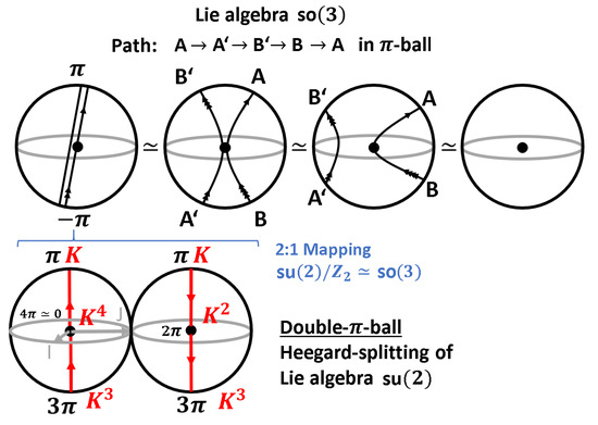 As shown in Figure 1 and Figure 2, the rotation by around a given axis is given by the straight line with . It is a well-known fact from group theory that this closed path is not equivalent to the Null homotopy. Indeed, as can be seen in Figure 2, only after a second traversal, the path can be deformed to the Null Homotopy (that is, to the identity element in at the origin of the -ball). Paul Dirac proposed a fascinating method to illustrate the corresponding motion in real space , that is, on the level of the group SO(3) acting on, say, a unit ball (A simulation program for the Dirac belt trick can be found in http://ariwatch.com/VS/Algorithms/Antitwister.htm). We attach this unit ball with elastic ropes (equivalently, with paper strips) to the boundary of a very large fixed outer sphere. The action of each group element g on the unit ball is encoded in the twists of the ropes (the paper strips). As shown in Figure 3, each rotation by can be realized as an inner in the paper strip attached to the rotated unit ball. Indeed, it can be shown that four inner twists can be undone, but not two. This exactly corresponds to the Null Homotopy shown in Figure 2 with two traversals, that is, a -rotation (You can convince yourself of this Null homotopy: Take a paper strip and rotate it four times. You may untwist it as shown in https://vimeo.com/62228139).