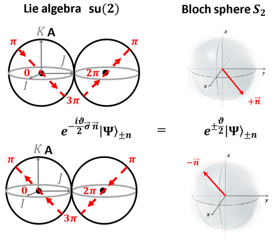 Next, we want to discuss this time development using group theory similar to Section 2. On the Bloch sphere , the state vector described by rotates on a cone shell around the axis defined by the direction of the magnetic field , as shown in Figure 1. The double cover of can be seen explicitly by comparing Equation (1), which corresponds to the point at in Figure 2, with Equation (4). We find