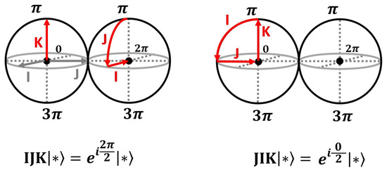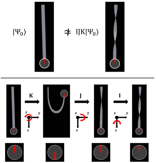 Note that this result crucially relies on the difference between the paths and , as shown in Figure 5 on the level of the Lie algebra. The action on a given the quantum state by the corresponding group element in SU(2) is shown in Figure 6. Concerning the eigenvalues, the assumption of noncontextuality translates to the statement that the eigenvalues of each spin-flip operator (14) would be independent of the context. This implies that the product of eigenvalues of all rows and columns is independent of the combination of other observables involved, that is,