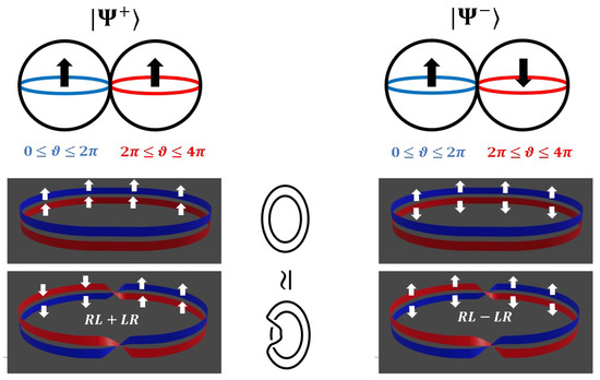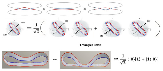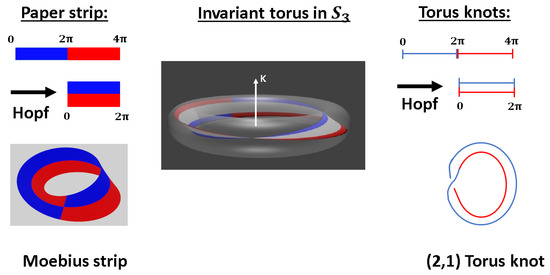 As shown in Figure 7, the Dirac belt with four inner twists is mapped to a Möbius strip with one twist after gluing together the two pieces and of the Dirac belt [4]. This describes the 2:1 Hopf-mapping from the -realm, that is, the Hilbert space, to the -realm, that is, observables.