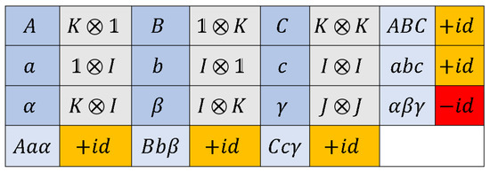 Following Peres and Mermin, we consider a combination of spin-flip operations acting on a system of two qubits, as shown in Figure 11. Indeed, in each row and each column, the observables mutually commute, and can be measured simultaneously. On the level of the spin-flip operators, the product of all rows and columns is given by