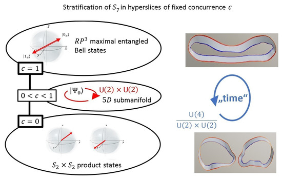 where c is the concurrence as defined in (31). We conclude that local transformations do not affect the concurrence. As shown in Figure 13, for , the tangent space is five dimensional, while describes the space of product states in two independent Bloch spheres . For , we obtain the maximally entangled Bell-states in . Only the small subset for defines the product states in , which are the only qubit states within which can be measured independently from each other. In this case the Hopf mapping leads to two independent Bloch spheres as . Thus, within , no ’parallel universe’ with some additional with is ’hidden’ somewhere.
