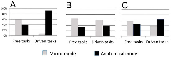 A recent research investigated the imitative behavior in patients with therapeutic corpus callosum (CC) resection and in healthy adults with an intact CC [25,26]. The study analyzed the perspective used by participants in imitating intransitive gestures. It has been shown that all subjects, when executing spontaneous imitation (free task), used the mirror mode (60% controls, 66% callosotomy patients; Figure 1); when instructed to “use the same limb as the model” (driven task), the control group chose the anatomical mode (93%), but the callosotomy patients still preferred the mirror mode (i.e., 39% anatomical mode; Figure 1; [25,26]). Later, an impairment of the anatomical imitative competence has been evidenced also in psychotic patients (41% anatomical imitation in free sessions, 64% in driven sessions; Figure 1; [27]), suggesting that individuals with surgical resection, microstructure alteration (as those reported in schizophrenic patients [28,29]), or incomplete maturation of the CC [30], might be unable to execute the mental rotation. It has therefore been hypothesized that the different performances of the two patient groups with respect to the controls could possibly be due to an impaired capacity for mental rotation, in which the corpus callosum (CC) might have a role. The need of the CC seems thus to suggest that anatomical imitation, and therefore mental rotation ability on which anatomical imitation is based, are sustained by neural circuits including cortical areas of both hemispheres with different functions, according to an asymmetric distribution of competences.