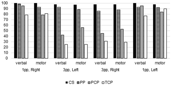 Figure 4. Performance of control subjects (black bars), psychotic patients (dashed bars), partially callosotomized patients (gray bars) and totally callosotomized patients (white bars), in verbal and motor sessions, in first and third person presentation, shown as mean percentage values, as a function of the position of the model. When the model was presented in the first person perspective, fewer errors were made by patients. Callosotomized patients’ performance was lower when the model was in the third person perspective. CS, control subjects; PP, psychotic patients; PCP, partially callosotomized patients; TCP, totally callosotomized patients; 1pp, first person presentation; 3pp, third person presentation.