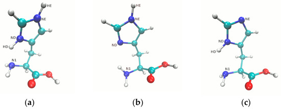 Structures of the studied forms of histidine: (a) Nδ-H and Nε-H protonation, HIP; (b) Nε-H protonation, HIE; (c) Nδ-H protonation, HID. Color coding: carbon, cyan; nitrogen, dark blue; oxygen, red; hydrogen, white.