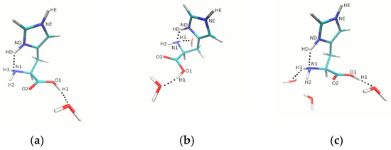 The second part of the analysis is devoted to the histidine (HIP, HIE and HID forms) surrounded by water molecules. The graphical representation of the microsolvation models is presented in the following figures: Figure 2 of the text body, and Figures S2I–S5I of the Supplementary Material. The metric parameters of histidine interacting with water molecules are listed in Table 2 and Tables S2I–S4I. The interactions between water molecules were not taken into account in these tables.