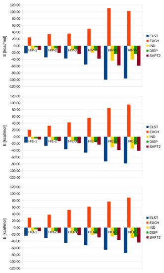 As noted in the Materials and Methods section, the SAPT approach allows us to identify the physical phenomena behind the interaction energy. A detailed partitioning of Eint is given in Table 7 and Figure 3 (for a quick visual examination of the importance of diverse terms and their relative changes), while Figure S11I shows the percentages of the contributions of four principal terms to the Eint, conserving their sign (thus the dimensionless Eint is always −1). These terms are: ELST (Coulombic interaction of nuclei and frozen electron densities of the monomers), EXCH (Pauli repulsion of the frozen monomer densities), IND (induction/mutual polarization, taking into account a relaxation of monomer electron densities and associated changes to the Pauli repulsion) and DISP (dispersion contributions)—see Equations (2)–(5) in [48] for a detailed list of the contributions included in these four general interaction energy components. The last term, DISP, is the least sensitive to the histidine protonation state. The permanent and frozen electric moments contribute to the ELST term, but in the studied case of the relatively “soft”, polarizable residue of histidine, this term is mostly cancelled out by the Pauli repulsion EXCH. In absolute values, ELST and EXCH dominate over the effects of polarization and dispersion. On the other hand, a rather good balance between ELST and EXCH makes polarization the most important factor for the actual interaction magnitude. This is especially true for the protonated HIP residue, wherein IND can be two times larger than the dispersion contribution. On average, for the HIP-n complexes, the magnitude of the dispersion term is ca. 60% of the induction, while for the neutral systems DISP is ca. 80% of the IND term. Surprisingly, the ELST term is not dramatically different between the charged and neutral complexes (although HIP-5 and HIP-6 exhibit very large ELST values), and we conclude that the increased stability of the charged complexes results from the ability of the HIP cation to polarize the surrounding network of the water molecules.