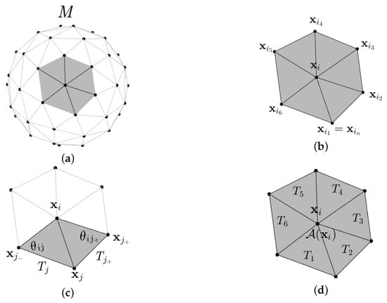 Schematic illustrations of (a) triangulation of surface, (b) the surface vertices set of one-ring neighbors of with , (c) triangles and with the angles and , and (d) area at vertex .
