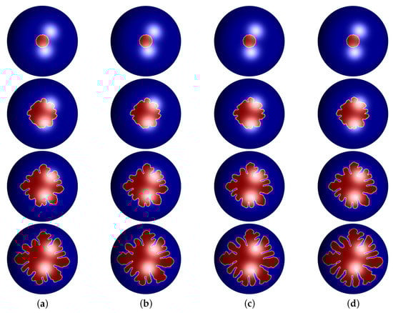 Snapshots of the evolution of crystal growth on the sphere having different time step size with , and . (a) , (b) , (c) , and (d) . The evolution time from top to bottom are , , , , respectively.