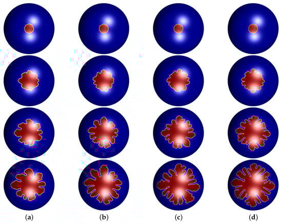 First, we confirm the effect of time step size and decide the appropriate for our simulations. Here, we set the initial radius , undercooling and use the same mesh size. Under these conditions, we select four time step size such as , and . As shown in Figure 2, the states of evolution look similar at same time. However, when and , the results of crystal show a bit less-growing than other two conditions, and Figure 2c,d show a satisfied performance. Therefore, we use as proper time step size for our simulations, while a smaller will take more computational cost.