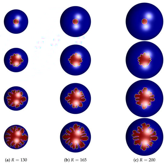 Snapshots of the evolution of crystal growth on the sphere having different radius R with and . (a) , (b) , and (c) . The evolution time from top to bottom are , , , , respectively.