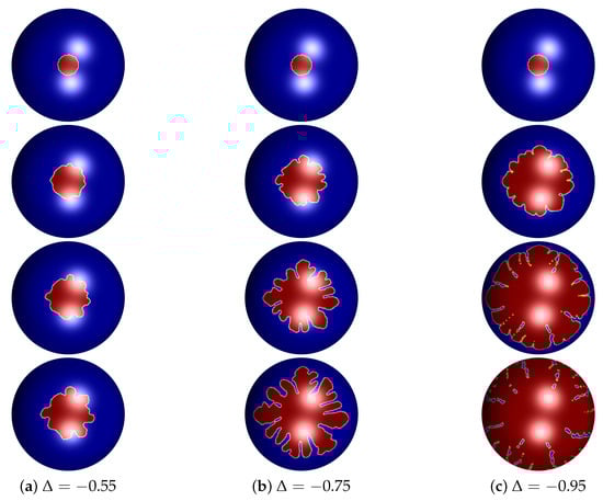 Snapshots of the evolution of crystal growth on the sphere with undercooling and different r. (a) , (b) , and (c) . The evolution time from top to bottom are , , , , respectively.