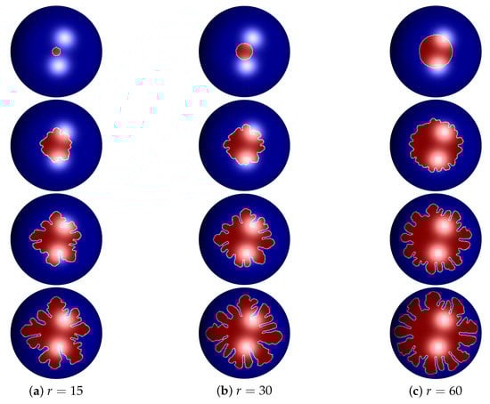 Figure 6 shows states of crystal growth on sphere with different initial radius r over time ( and ). The difference among three results is clear. Figure 6a shows that crystal sources with are less grown and branches are less stretched. However, results using show that crystals grow and branches stretch more as shown in Figure 6c. From this test, we can see that when the initial radius r of the source is large, growth is fast and branches of crystal are extended further.