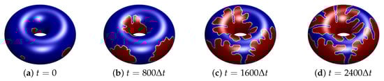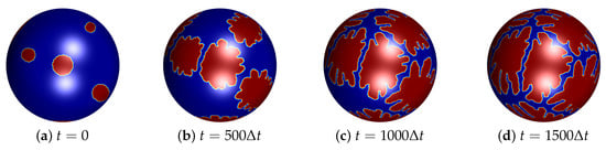 Meanwhile, there are several researches that have focused on pattern formation and computation on surfaces. García et al. [] focus on the mechanism of a crystal phase in two-dimensional curved space. Ren et al. [] simulate the dendrite growth by introducing an orientation field which is the degree of freedom, the algorithm can generate arbitrary symmetric graphs with different degrees of asymmetric damage effects on arbitrarily curved surfaces.