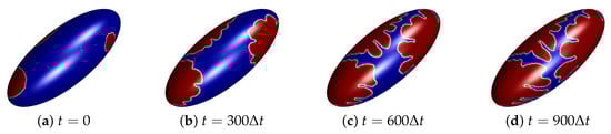 where denotes the ellipsoid surface. Three sources having different radius ( and 45) are located at different positions on the ellipsoid surface. Parameters used for this test are the same with the above test and Figure 8 shows the initial condition of ellipsoid with three sources and snapshots of evolution of these crystal growth at and .