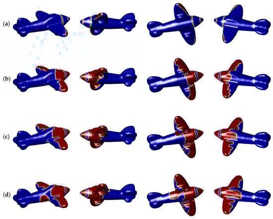 Snapshots of the evolutions of crystal growth on the surface of aircraft body and wings. We use and . The evolution time at each row is (a) , (b) , (c) , and (d) , respectively. Note that each column in each row shows the isosurface from different angle at the same time.