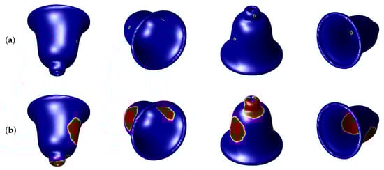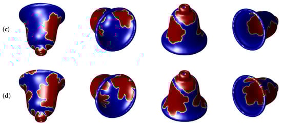 For the next example, we perform the similar test to the metal bell-shaped surface. We fit the isosurface of the metal bell-shaped surface to . The cubic interpolation is used to make the signed distance function of the metal bell-shaped surface in MATLAB. Figure 11 shows snapshots of the evolutions of crystal growth on the metal bell-shaped surface. Here, we use , , and .