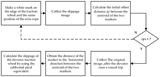 The displacement between the traction wheel and the wire rope will occur during the round-trip operation of the elevator, the slip detection method of the elevator traction wheel based on machine vision is to obtain the dislocation image of the traction wheel and the wire rope in the circumferential direction by marking, and the slippage between the traction wheel and the wire rope can be obtained by using the image nonlinear geometric transformation and centroid method. As shown in Figure 1, the slip detection process of the elevator traction wheel is as follows: