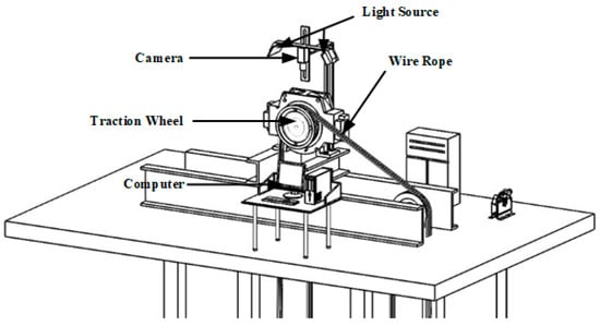 The experimental scheme of the elevator slip detection system is shown in Figure 2. The camera is placed directly above the elevator traction wheel through the aluminum profile bracket, and the centerline of the camera is adjusted to coincide with the central axis of the traction wheel. The camera is required to collect the slippage image that will be detected between the white marks on the traction wheel and the steel wire rope after a round-trip of the elevator. The slippage of the traction wheel is analyzed by using the image algorithm.