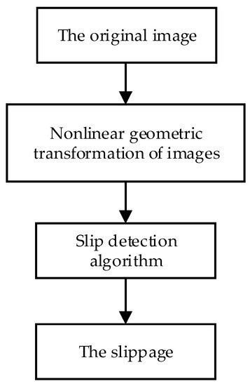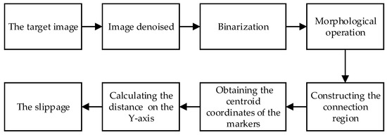 After the nonlinear geometric transformation of the image, the ROI image has been transformed into an image with equal distance, and its pixel equivalent is also a fixed value. The pixel-level distance between the two markers can be obtained by an image processing algorithm. The flow chart of the image processing algorithm for slippage detection is shown in Figure 11.