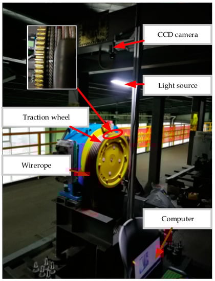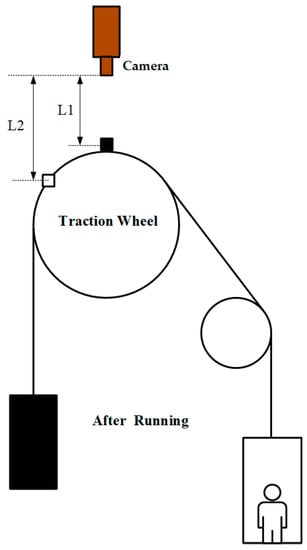 At present, some relevant scholars around the world have conducted some studies on the detection of elevator slippage. Zheng et al. [3] analyzed the causes of the traction elevator wire rope slippage from the perspectives of the traction capacity, balance coefficient, cage quality, etc., but no in-depth quantitative research has been conducted. From the three perspectives of the matching of the wire rope and the tractive sheave groove, the wheel groove wear, and the angle between the traction wheel and the wire rope, Chen et al. [4] identified the causes of the change in the traction; in the case that the design value conforms to the national standard, the traction coefficient will increase due to improper installation, operation and maintenance, and relevant improvement suggestions are proposed. Ma et al. [5] established an exclusive test platform to study the effects of friction and slippage under different traction conditions, and concluded that slippage occurred at the end of the contact arc, expanded to the middle, then the entire traction wheel, and finally to the wire rope. Liu et al. [6] proposed a method to measure the slippage of the traction elevator wire rope by using a photoelectric encoder. The photoelectric encoder, the coupling, and the roller are combined into a speed measuring wheel. The speed measuring wheel needs to contact the traction wheel and the wire rope to complete the slippage measurement. This contact-type measuring method will accelerate the wear of the speed measuring wheel and decrease its service life. He et al. [7], according to the movement characteristics of the contact interface between the traction wheel and the wire rope, proposed a real-time, non-contact method based on image morphology, to measure the slippage between the traction wheel and the wire rope. However, there was no on-site test, so the feasibility of the detection algorithm in a real environment needs further validation.
