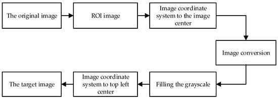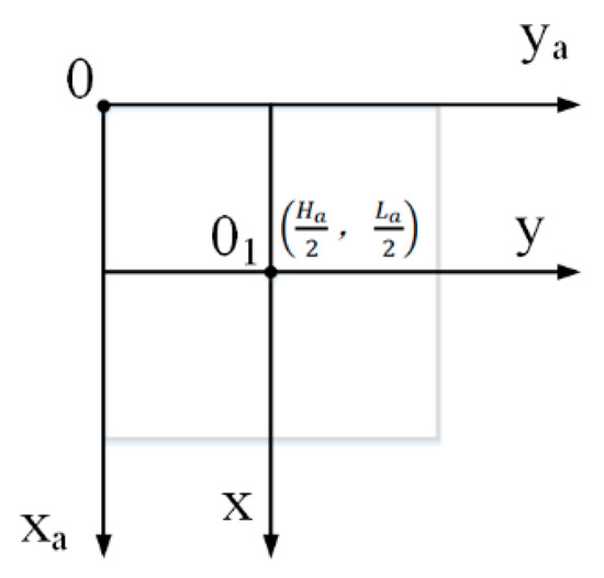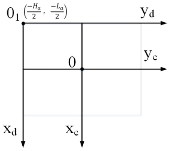 The principle of translation of the origin of the image coordinate system to the image center is shown in Figure 6. The origin of the ROI image coordinate system is transferred from the upper left corner of the image to the center of the image. The origin of the coordinate system is shifted to the point by using Formula (1), where is the length of the X-axis of the ROI image, is the length of the Y-axis direction, is the coordinate in the ROI image, and is the coordinate after translation.