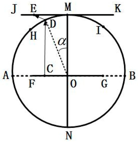 An image transformation is required after the image coordinate system has been shifted to the center. Figure 7 shows a schematic diagram of the nonlinear geometric transformation of the image. The circle is the main view of the traction wheel, and the reference position M is the intersection of the line where the main optical axis of the camera is located and the Y-axis of the ROI image. The target images JK and M are in the same plane and parallel to the camera lens. After being projected by the camera, the real image arc HI is transformed to the original image FG. Point C is any point in the original image, point D and point E are its corresponding point on the real image and target image, respectively.