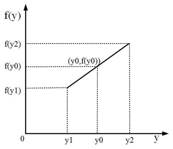 Grayscale filling: The y coordinate of the target image obtained by the ROI image after image transformation is a kind of floating point, so it is impossible to directly fill the pixel with the grayscale; therefore, the linear interpolation method should be used in the Y-axis direction to fill the target image with the grayscale [12,13]. The principle of the linear interpolation is shown in Figure 8. y0 is the corresponding y coordinate of the pixel points in the ROI image after the inverse transformation of the nonlinear geometric transformation of the image, and y1 and y2 are the coordinates of integer parts adjacent to y0. f(y0) is the gray value to be filled. Formulas (4) and (5) can be used to calculate f(y0).
