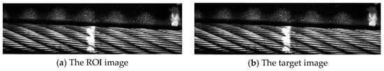 Figure 5 shows the flow chart that describes the method of obtaining the target image through a nonlinear geometric transformation of the original image. To reduce the redundant information of the image, the ROI range of the original image is first selected to obtain the ROI image, which can reduce the computation amount of the algorithm and shorten the processing time of the algorithm [10,11]. The selection of ROI range in the X-axis direction should fully include the wire rope and the edge of the traction wheel; and the selection in the Y-axis direction, the main optical axis of the camera should be used as the symmetry axis with the two white markers included.