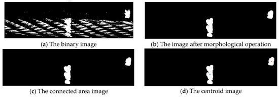 In the test, white was used as the color of the marker, as there is an obvious contrast between white and black. As a result, there is a significant difference in the gray value between the marker and the background, and the fixed threshold method can be used to binarize the image [16,17]. The binarization image is shown in Figure 12a.
