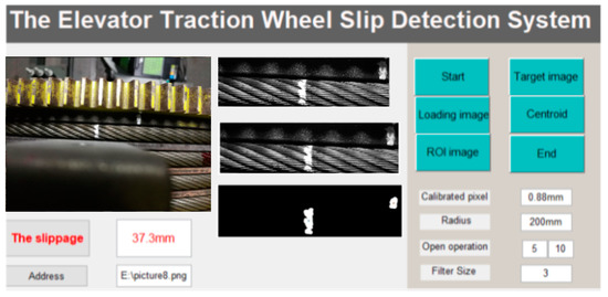 As shown in Figure 13, the experimental platform of the elevator traction wheel slip detection system is built, which includes a camera, a lens, a light source, a moving platform for adjusting the camera distance, an elevator traction wheel, a wire rope, and a computer. The camera adopted is a CCD camera, the resolution is 2448 × 2050, the frame rate is 20 fps, the pixel size is 3.45 × 3.45 µm, the sensor size is Type 2/3, and an 8 mm lens is installed. The CCD camera is fixed directly above the connection part of the traction wheel and the wire rope by a moving platform, and the distance is approximately 400 mm. The light source is a 12 W white strip light source with an effective size of 190 × 42 mm. The light source is installed on the oblique top of the connection part between the traction wheel and the wire rope. The brightness of the light source can be adjusted by the controller. The reflected lights of the two white markers are collected through the camera, and the local enlarged images of the two marks are located on the upper left corner after the two white markers are displaced. The user interaction interface of the elevator traction wheel slip detection system is shown in Figure 14. Here, we can achieve the image acquisition, image algorithm processing, and data analysis of the traction wheel slip image.