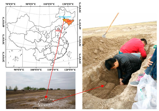 The western area of Jilin Province is a typical saline soil region in China. The study area is located in the low-lying Songnen Plain, which belongs to a semi-humid and semi-arid climate and is also a typical seasonal frozen soil area. Because of climate and environmental geological factors, salt accumulates more easily on the surface of this area. As a consequence, vegetation in this area is scarce and the ecological environment is fragile (Figure 1). Temperatures below zero in winter last from November to March every year, resulting in surface freezing and upward salinity migration under the influence of the temperature gradient. Precipitation is concentrated from June to August, and the annual precipitation is low. The average precipitation from 2008 to 2018 in Zhenlai is shown in Figure 2, along with the rainfall data collected from China Meteorological Science Data Center. The average precipitation is distributed symmetrically, with the highest in July. In spring and autumn, evaporation is especially strong, so a large amount of salt accumulates on the soil surface year by year under the action of concentration gradient, which makes Jilin Province a typical saline soil area.