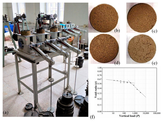 The structural yield strength (SYS) of the saline soil in Zhenlai is obtained by the high pressure consolidation test: (a) Triple high pressure consolidation apparatus produced by Nanjing Soil Instrument Factory; (b) soil sample: ω = 15%, S = 0.4%, C = 90%; (c) soil sample: ω = 17%, S = 0.4%, C = 90%; (d) soil sample: ω = 19%, S = 0.4%, C = 90%; (e) soil sample: ω = 23%, S = 0.4%, C = 90%; (f) Compression curve of saline soil in double logarithmic coordinates.