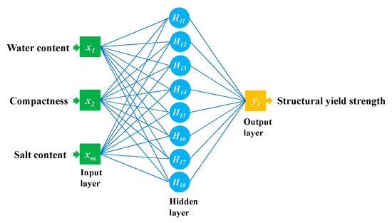 In this study, the BPNN model adopts a three-layer network structure, because the BPNN with a hidden layer can simulate a highly complex nonlinear function when the neuron number in the hidden layer is sufficient [47]. There are three input variables: water content, compaction degree, and salt content. The output variable is the SYS. The “logsig” function is applied to the hidden layer, and the “tansig” function is applied to the output layer. The maximum number of iterations is set to 30,000, and the learning rate is set to 0.8.