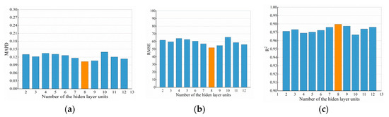 Average values of model evaluation parameters when the hidden neurons of the back propagation neural network (BPNN) varied: (a) coefficient of determination (R2); (b) root mean square error (RMSE); (c) mean absolute percentage deviation (MAPD).