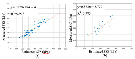 Relationship the estimated SYS (structural yield strength) of the BPNN-1 models (dewatering) and measured SYS: (a) BPNN-1 in training stage; (b) BPNN-1 in testing stage.