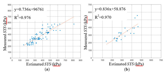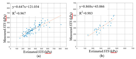 Relationship the estimated SYS (structural yield strength) of the BPNN-2 models (de-compaction degree) and measured SYS: (a) BPNN-2 in training stage; (b) BPNN-2 in testing stage.