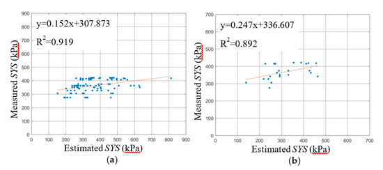 The relationship curve between the estimated SYS and the measured SYS of the BPNN model is shown in Figure 9, Figure 10 and Figure 11. The slope and intercept of the fitting curve also reflect the prediction effect of the model. By comparing the fitting lines between the predicted data of the BPNN-1, BPNN-2, and BPNN-3 models and the experimental data, we found that the predicted results of the BPNN-1 model are the worst, while those of the BPNN-3 model are the best.