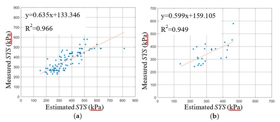 Relationship between the estimated SYS (structural yield strength) of the SVM models and measured SYS: (a) training stage; (b) testing stage.
