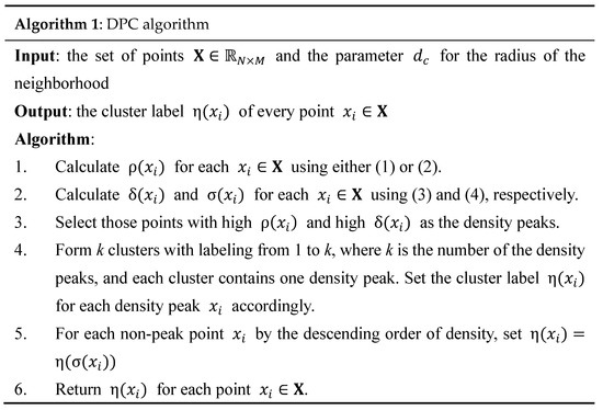 Notably, because (5) is recursive, we must ensure that is calculated before . This can be achieved by performing the cluster assignment for the non-peak points by the descending order of their densities. Figure 2 shows the DPC algorithm.