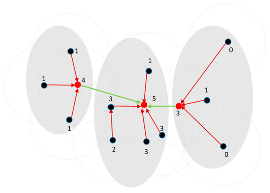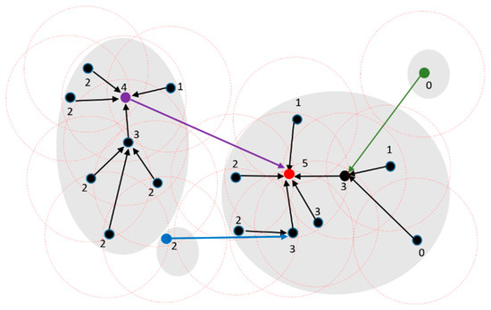 Recall from Section 2.1 and Figure 3 that DPC constructs a directed tree with a sink vertex. As with DPC, Stage 1 of DPSLC also constructs a directed tree. Figure 5 shows an example where each filled circle and the integer next to it represent a point and the point’s density (based on Equation (1)), respectively, and each red dashed circle shows the neighborhood of a point. Each link connects a point to its nearest higher-density point; the red filled circle is the point with the highest density, which is also the sink vertex of the directed tree.