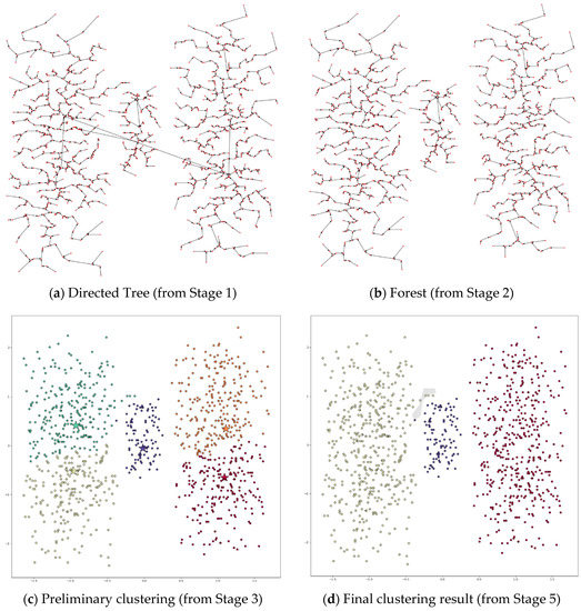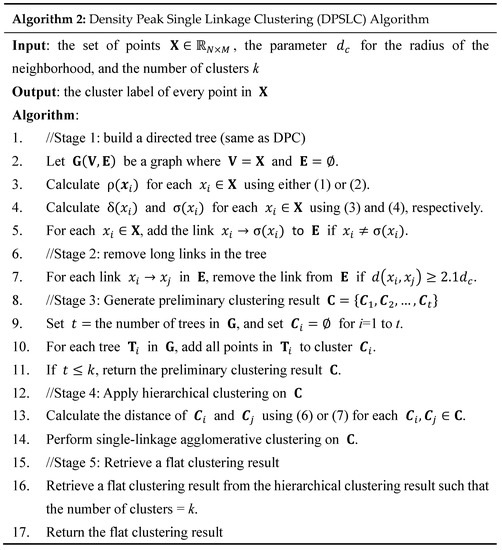 This section describes the proposed method that avoids DPC’s drawbacks described in Section 1. Specifically, the proposed method does not need to manually select the density peaks and does not place a point and its nearest higher-density point in the same cluster if the two points are far apart. The proposed method contains five stages: build a directed tree, remove long links, generate preliminary clustering, apply hierarchical clustering to the forest, and generate flat clustering results. The proposed method, referred to as density peak single linkage clustering (DPSLC), is shown in Figure 4.