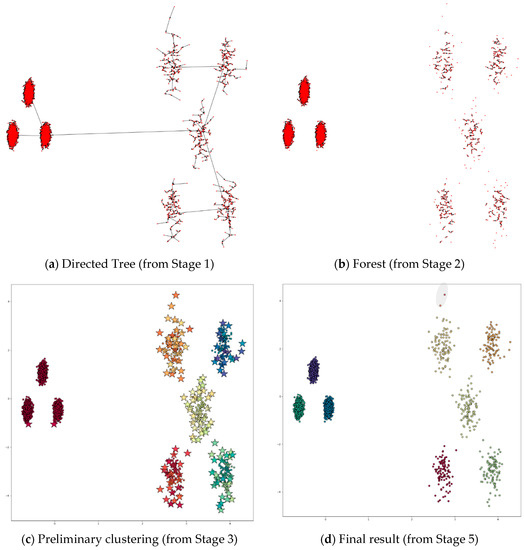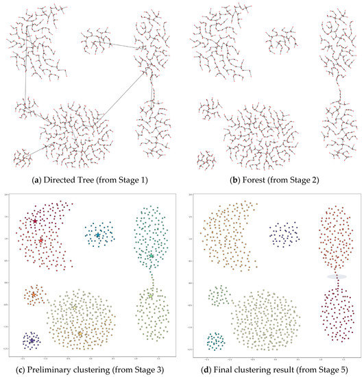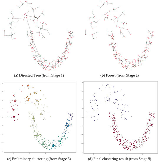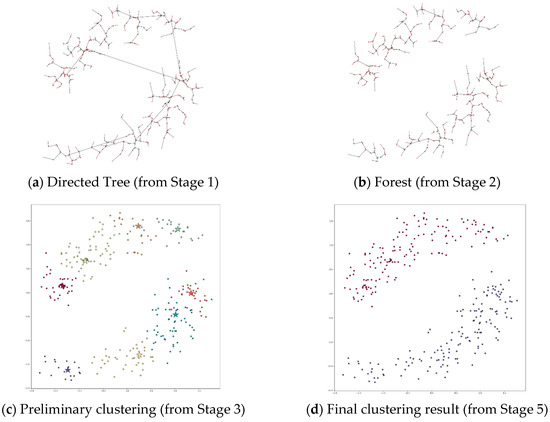 Figure 7 shows the process of applying DPSLC on dataset T300. The directed tree generated in Stage 1 contains several long links (see Figure 7a), which are subsequently removed in Stage 2 (see Figure 7b). The preliminary clustering result contains eight clusters where the star symbols indicate the positions of the density peaks (see Figure 7c). The final clustering result contains two clusters.