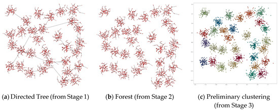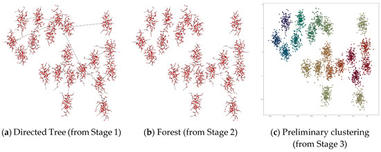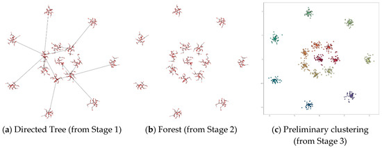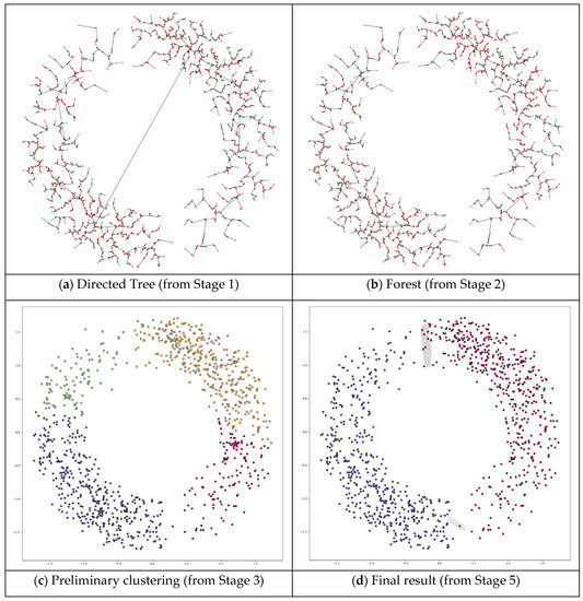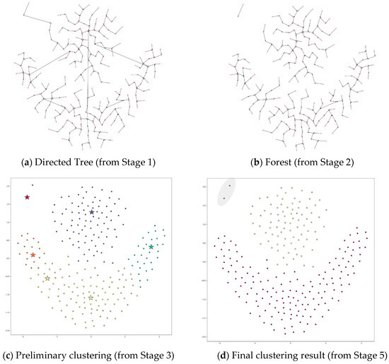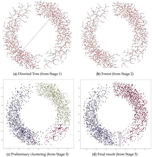 Stage 3 of DPSLC constructs a preliminary clustering result by forming a cluster for each directed tree in the forest. The four gray regions in Figure 5 show the four clusters generated in this stage.