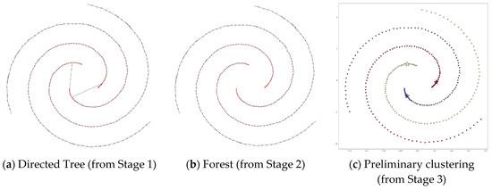 Figure 13, Figure 14, Figure 15, Figure 16, Figure 17 and Figure 18 show the process of applying DPSLC on datasets Spiral, R15, D31, A1, T2000, and T1000, respectively. For datasets Spiral, R15, D31, and A1, DPSLC ends at Stage 3 because the number of clusters has reached the desired k value.