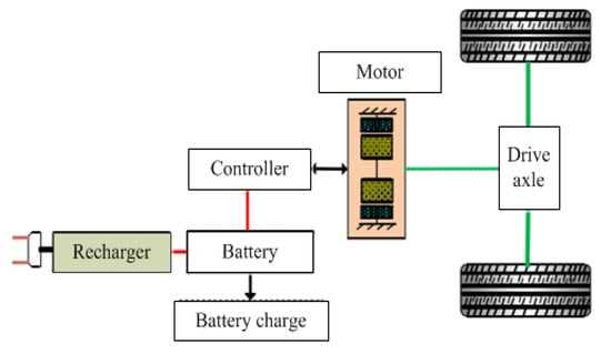 With the increasing demand for a green economy and environmental protection, modern vehicles are required to produce zero emissions, much less pollution, and little noise []. Electric vehicles, which use a drive motor and a battery instead of a traditional internal combustion engine, can achieve higher driving efficiency and control precision. Especially for the characteristics of constant torque at low speeds and constant power at high speeds, the power transmission system of electric vehicles can be tremendously simplified so as to improve the dynamic performance [,].