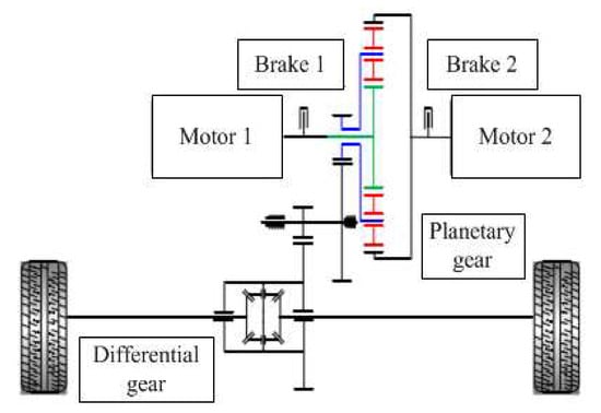 The dual-motor coupling drive system (DCDS) is a popular research topic in the field of electric vehicles []. Compared with a normal single-motor driving axle system, the DCDS, which adopts two motors rather than a high-peak-power motor, can significantly improve a vehicle’s dynamic performance and energy efficiency []. The typical applications of the single-motor driving axle system and the DCDS are shown in Figure 1 and Figure 2, respectively. In Figure 2, two brushless direct current motors (BDCM) are utilized with particular gear transmission equipment, such as a planetary gear, a differential bevel gear, and so on. The drive power of the dual-motor system is synthesized and transferred by the gear transmission system. During the driving process, the main motor is operated at a rated speed to improve energy efficiency. The assistant motor is controlled to adjust the rotational speed. To improve the smoothness of stepless speed regulation, the dynamic and vibration characteristics of the DCDS need to be analyzed.