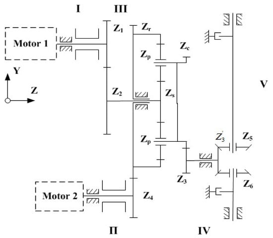 Solve the characteristic equation , which shows that the natural frequencies can be obtained. The rotational speeds of the dual motors were set to 0–3000 r/min. The diameters of shaft segments I–V were 0.020, 0.018, 0.025, 0.030, and 0.030 m, respectively, and the modulus of elasticity E = 2.06 × 1011 Pa. The parameters of the planetary gear and differential bevel gear for the computational analysis are shown in Table 1.