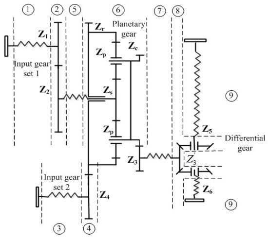 The generalized dynamic model of the DCDS is presented in Figure 4. To study the dynamic characteristics of the transmission process, the mass (inertia) of the dual motors and the main body of the gears are supposed to be a lumped mass (inertia). The shaft segment between each lump mass is considered to be a massless torsional spring.